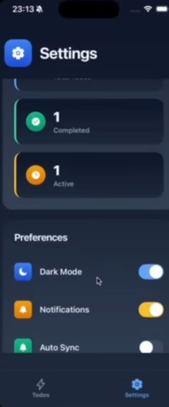 Allows user preferences (dark mode, notifications, auto-sync, etc.)